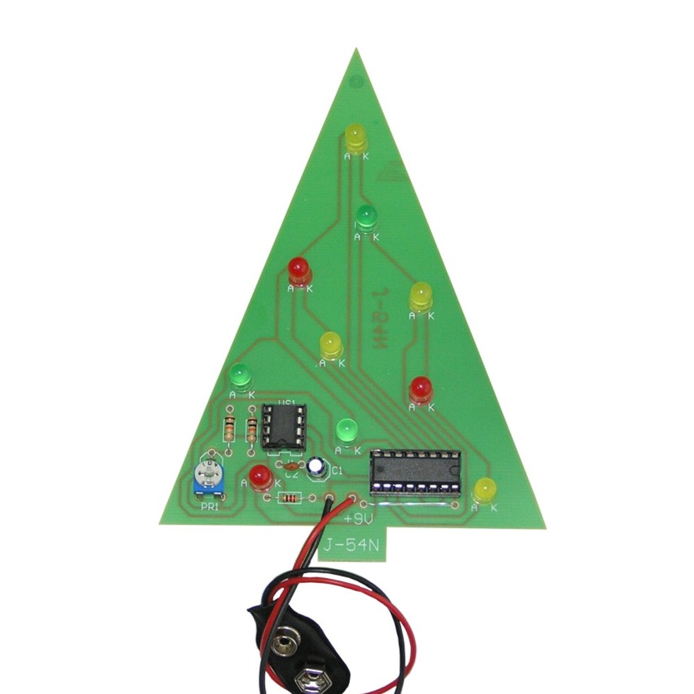 Elektroniczna ozdoba choinkowa. Na płytce montażowej w kształcie choinki zapalają się kolejno różnokolorowe diody LED. Układ można zasilać z baterii 9V. Wymiary płytki 125×87 mm.